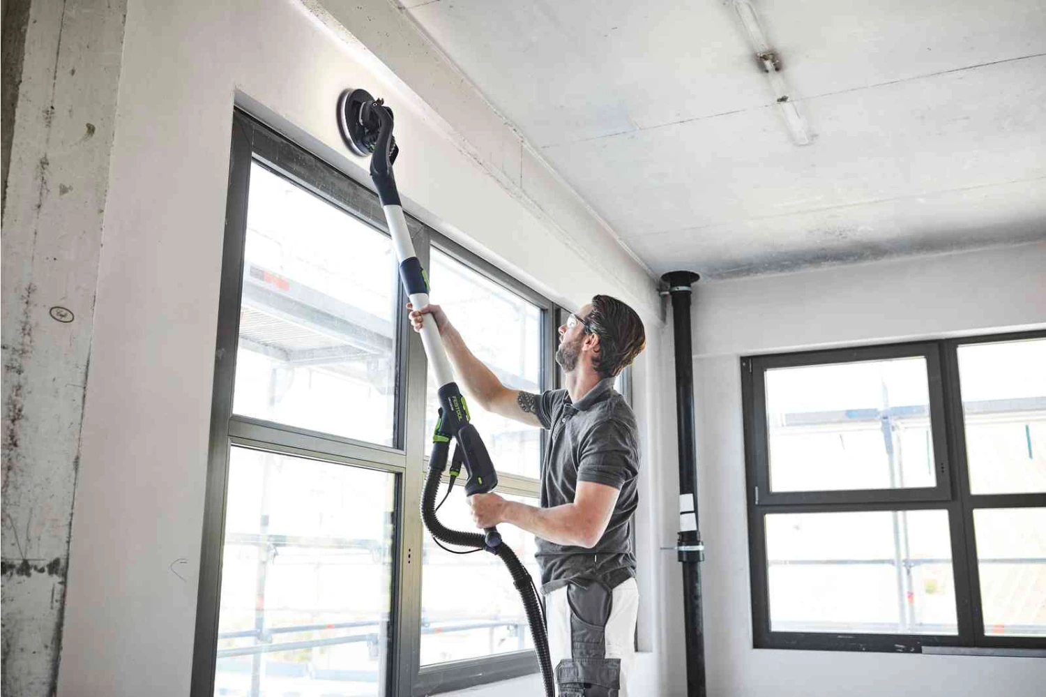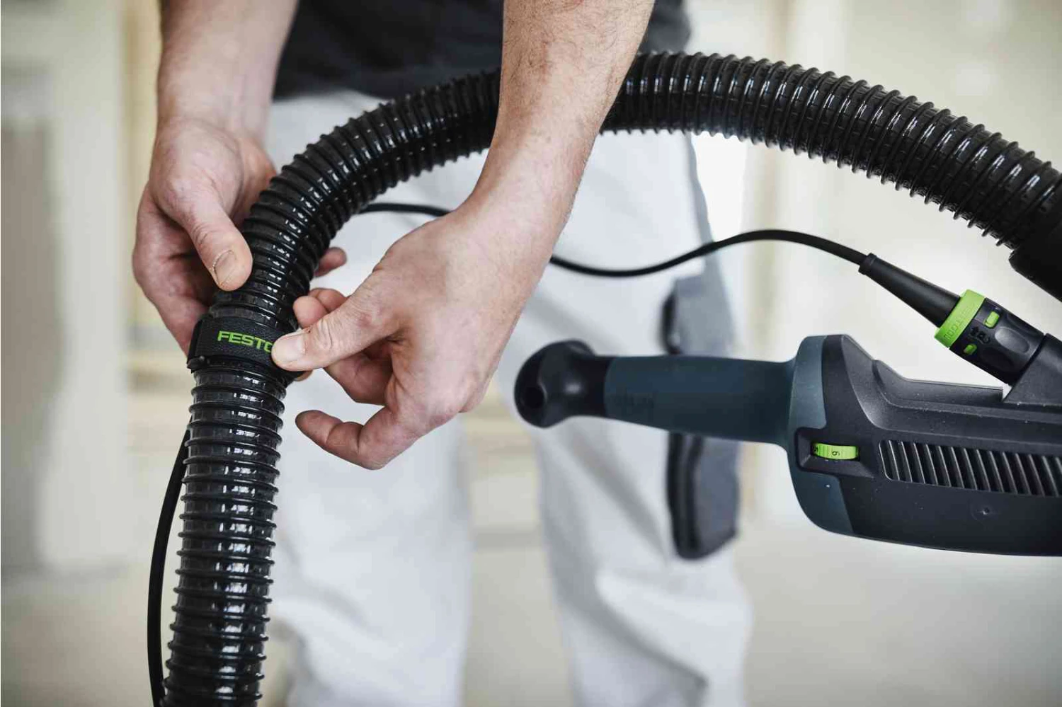 - Unobstructed handle area when sanding ceilings: Holds the hose and cable to the handle Ð at a comfortable distance away from your hand